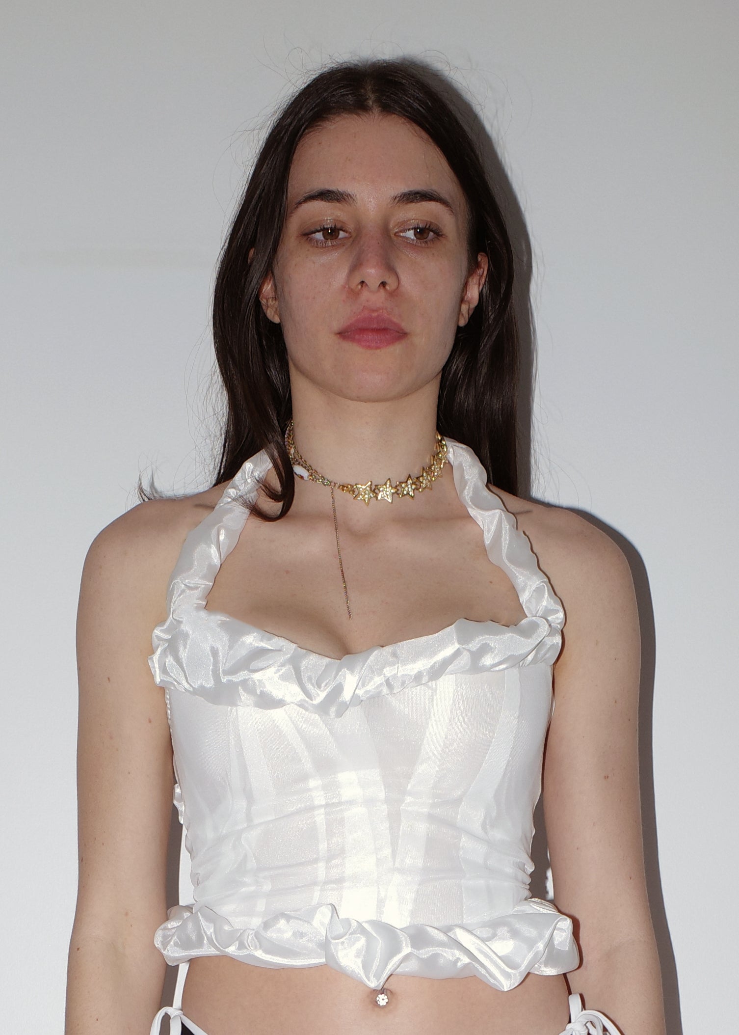A CULT FAVOURITE MULTI-FUNCTIONAL, STRETCHY CORSET THAT LOOKS WET AND FEELS LIKE BUTTER. MADE WITH TECHNICAL ITALIAN JERSEY FOR EXTREME COMFORT AND SIZE FLEXIBILITY. DRAMATIC RUCHING ON THE NECKLINE & HEM FRAMES THE BUST AND CURVES OF THE BODY.