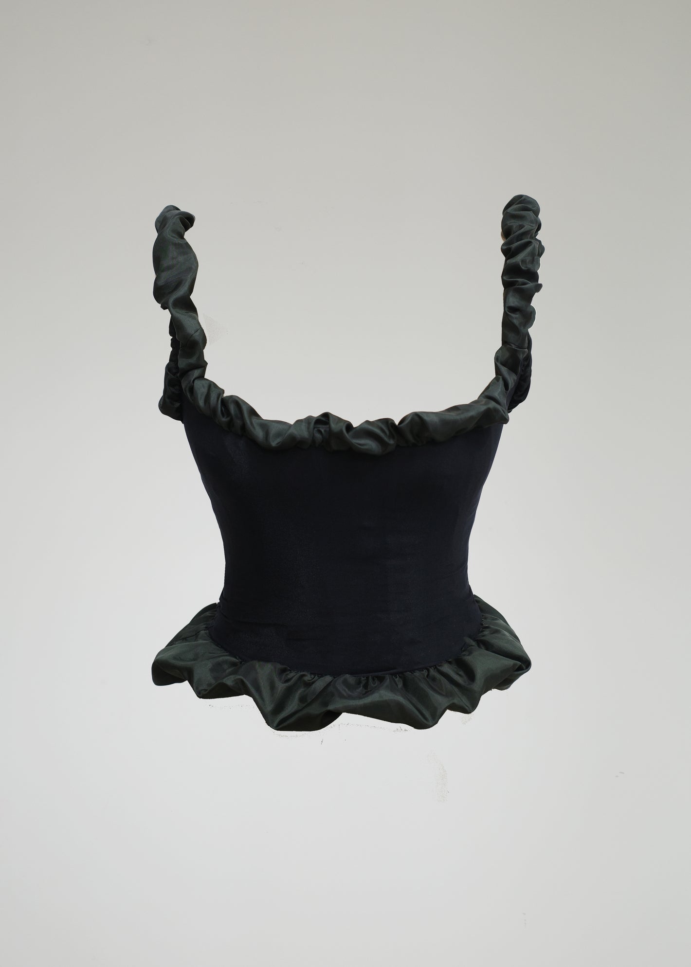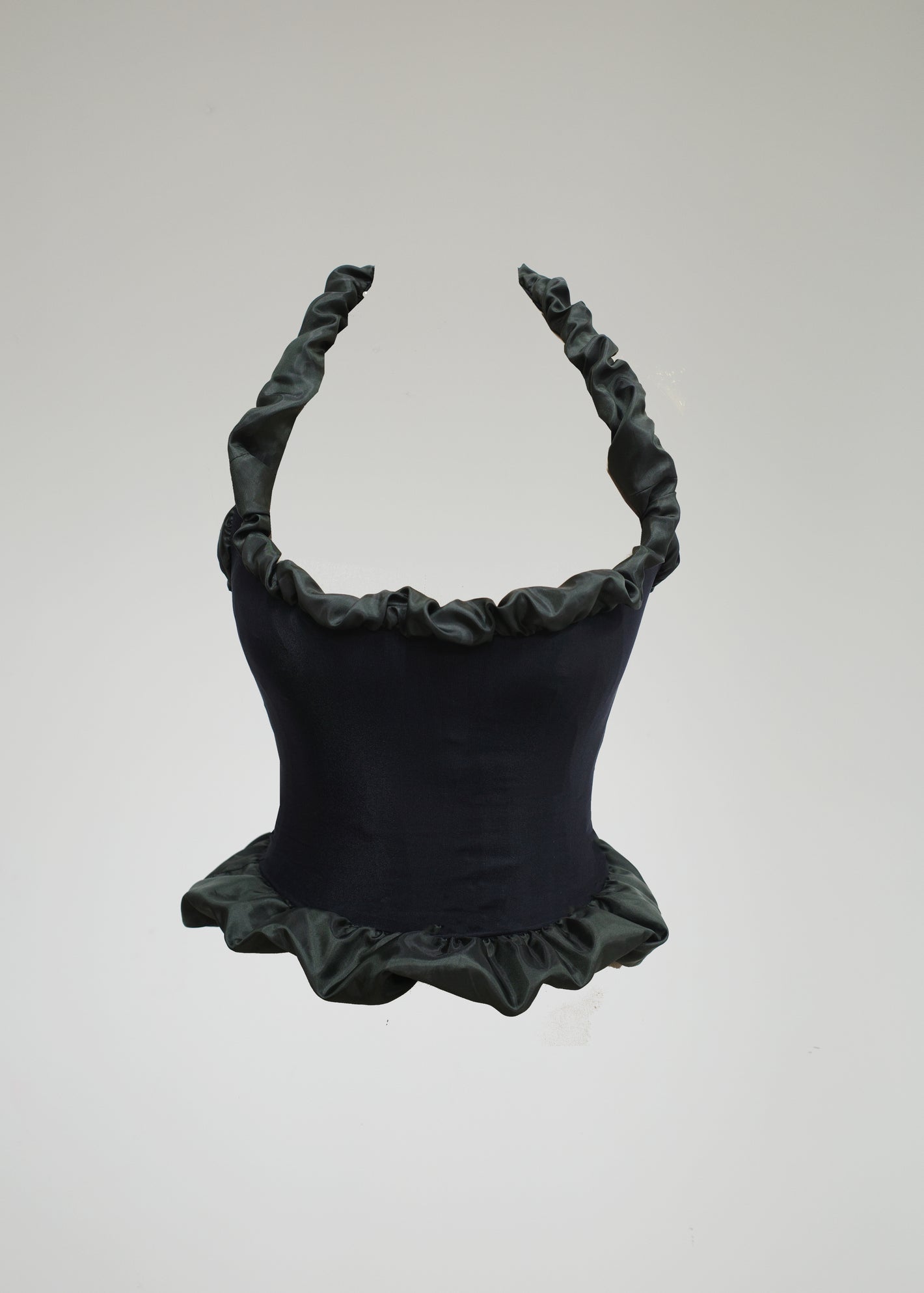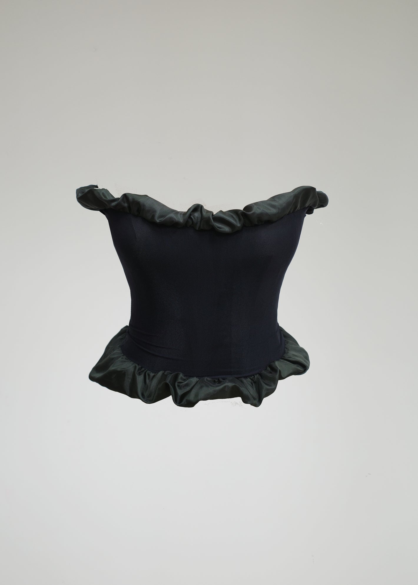 A CULT FAVOURITE MULTI-FUNCTIONAL, STRETCHY CORSET THAT LOOKS WET AND FEELS LIKE BUTTER. MADE WITH TECHNICAL ITALIAN JERSEY FOR EXTREME COMFORT AND SIZE FLEXIBILITY. DRAMATIC RUCHING ON THE NECKLINE & HEM FRAMES THE BUST AND CURVES OF THE BODY.