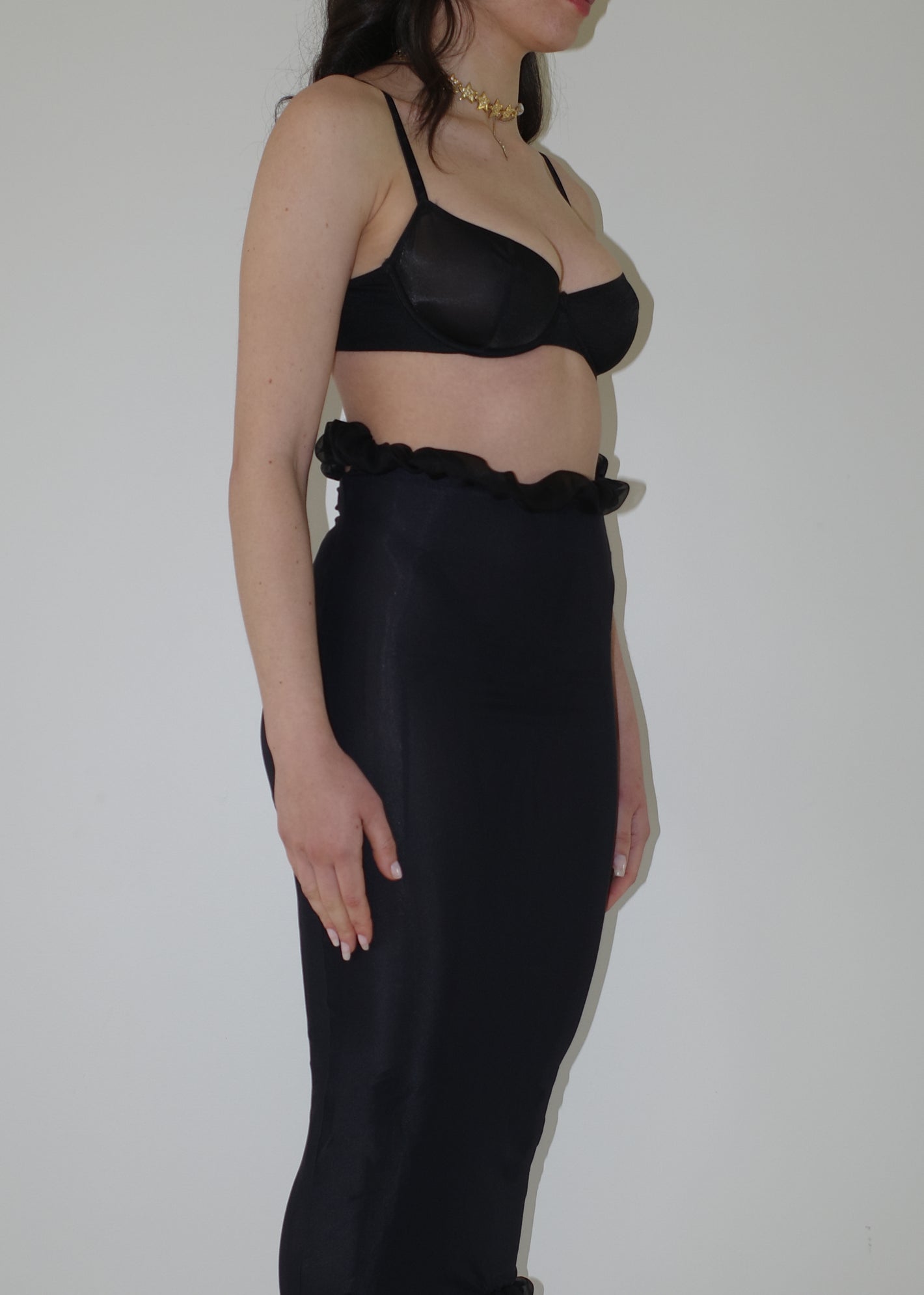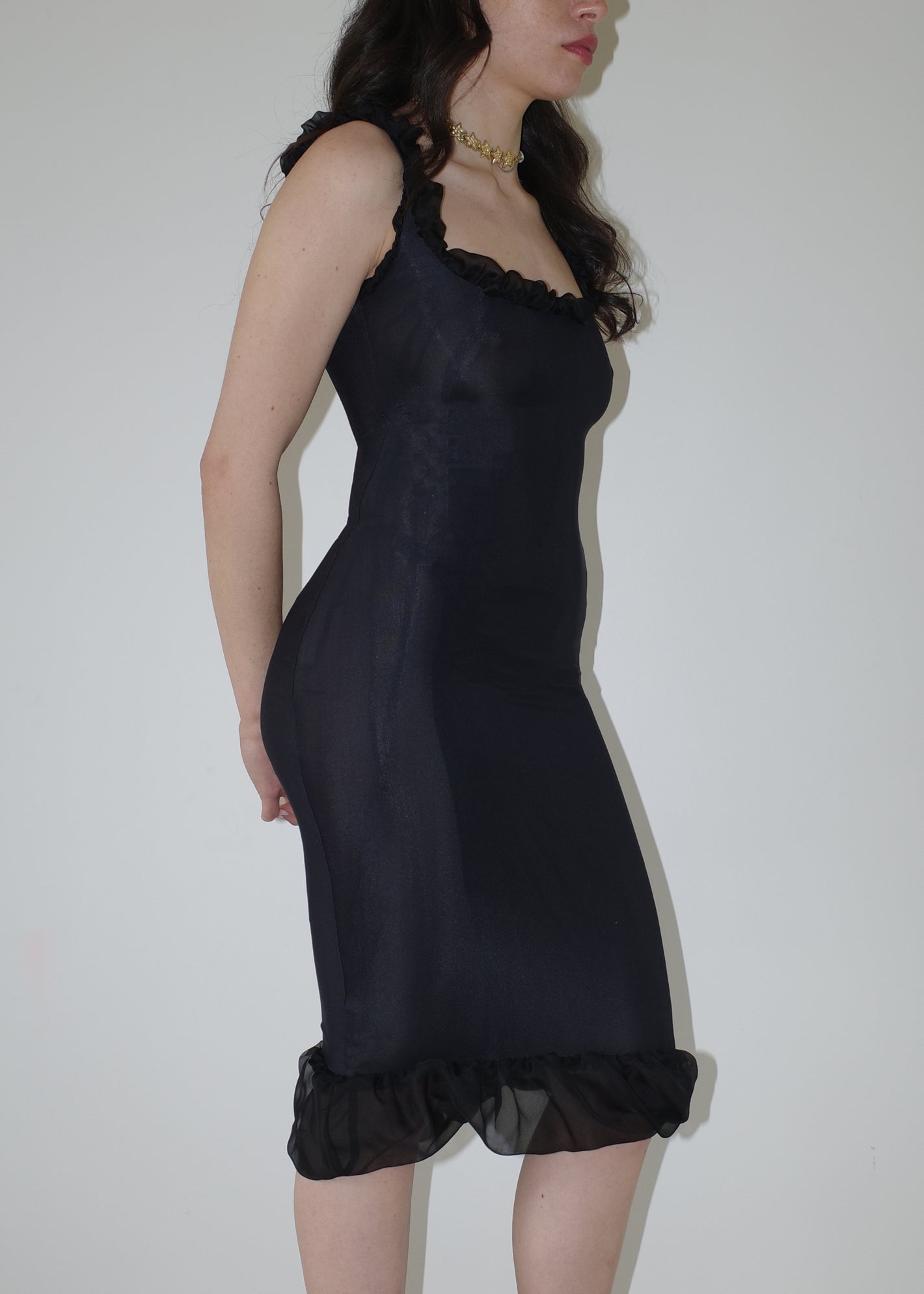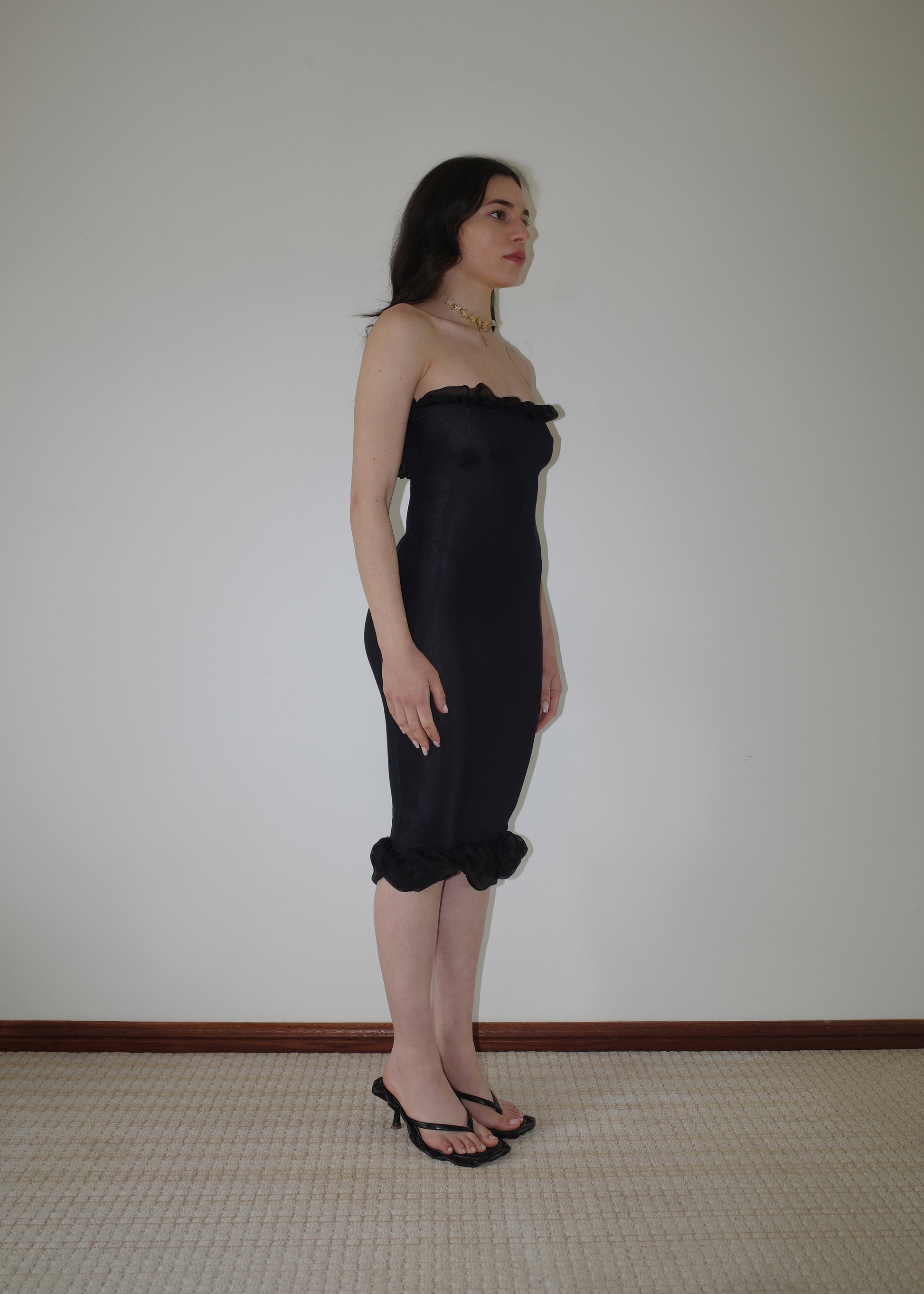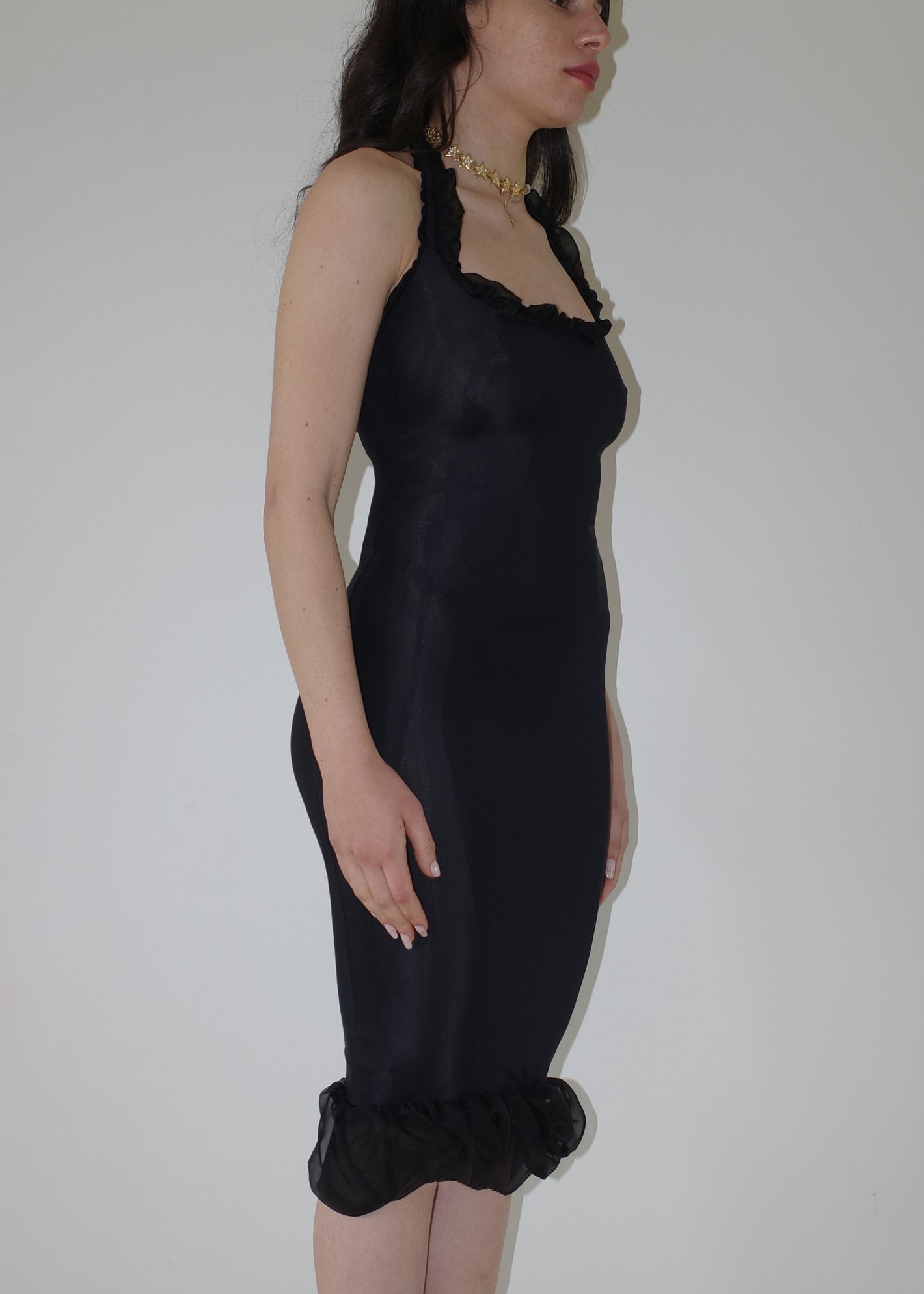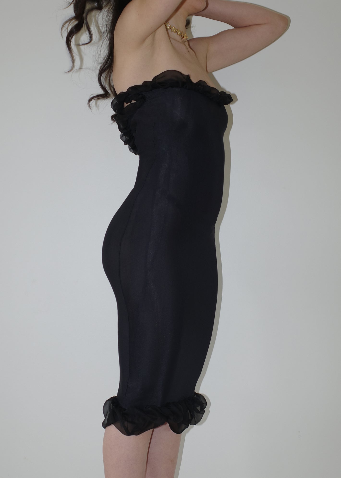002 CONTOURS THE BODY WITH TECHNICAL ITALIAN JERSEY THAT STRETCHES AND CONTRACTS  FOR EXTREME COMFORT AND SIZE FLEXIBILITY. DRAMATIC RUCHED SILK LINING ON THE NECKLINE & HEM FRAMES THE BUST AND CURVES OF THE BODY.
