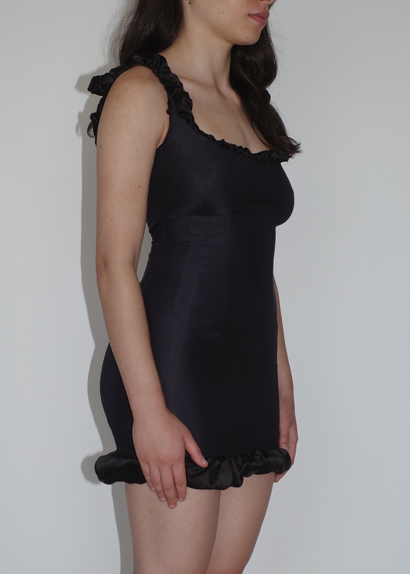 002 CONTOURS THE BODY WITH TECHNICAL ITALIAN JERSEY THAT STRETCHES AND CONTRACTS  FOR EXTREME COMFORT AND SIZE FLEXIBILITY. DRAMATIC RUCHED SILK LINING ON THE NECKLINE & HEM FRAMES THE BUST AND CURVES OF THE BODY.