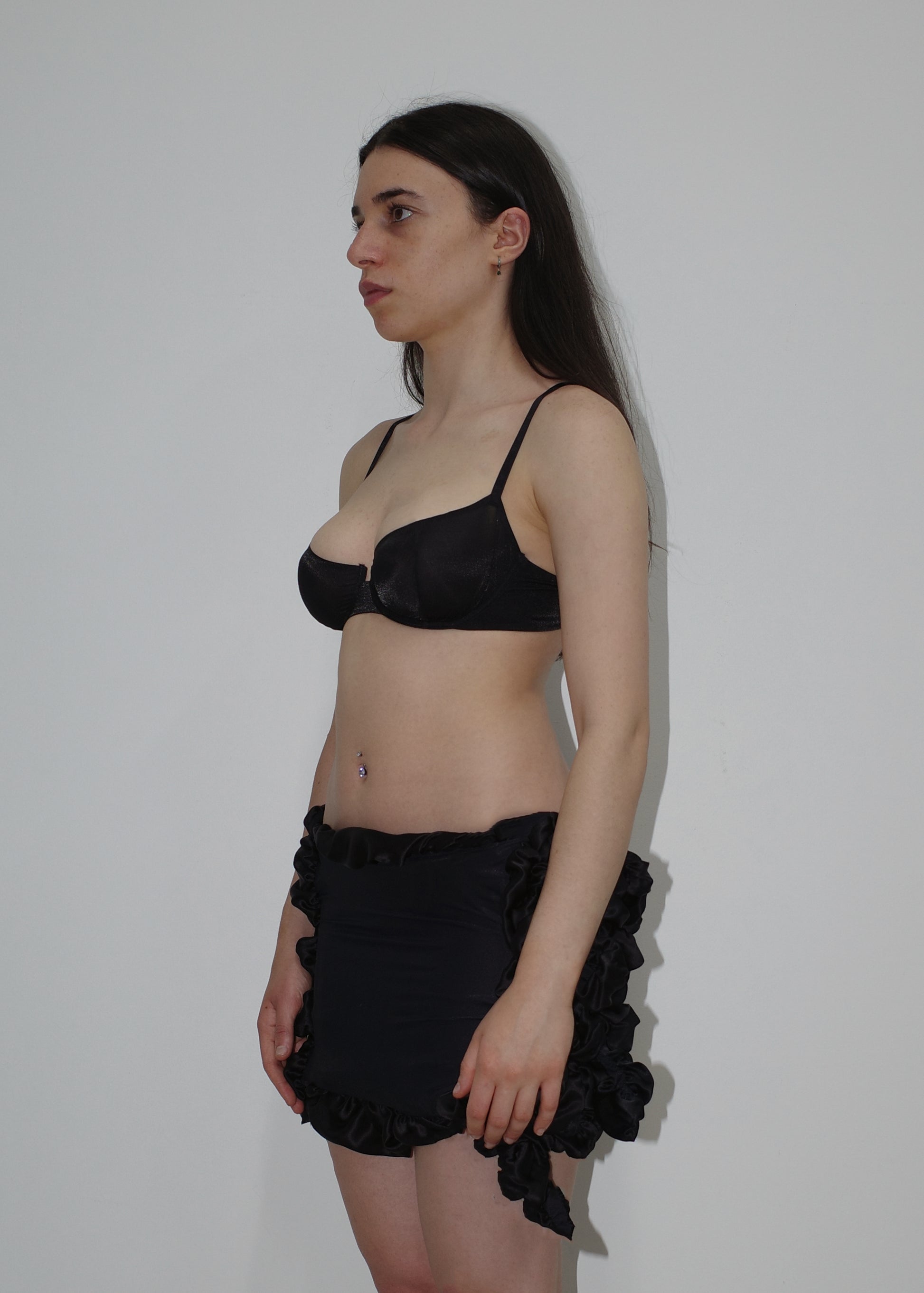 SKIRT - A SEXY,  FLEXIBLE MINI SKIRT WITH FRAMED DRAMATIC RUCHING. PERFECTLY SHAPES, CONTOURS AND EMPHASISES THE CURVES OF THE BODY. TURN IT INSIDE OUT FOR THE BAG VARIATION.